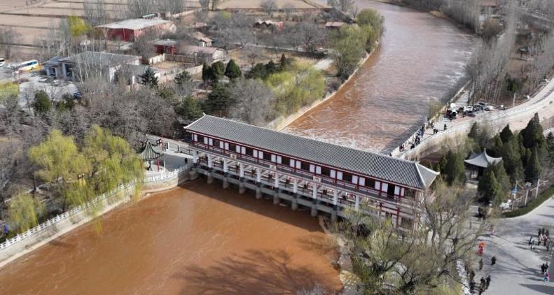 Vue aérienne d'une écluse ouverte déviant de l'eau du fleuve Jaune pour l'irrigation à Qingtongxia...