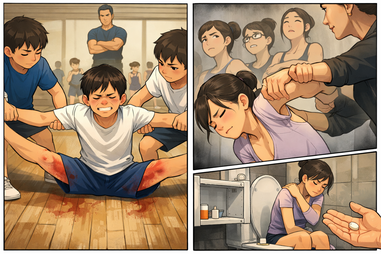 Les deux anciens artistes décrivent toutefois un environnement marqué par la peur et la pression constante. Sun Zan rapporte avoir subi des blessures graves lors d’exercices d’étirement forcé, notamment un grand écart latéral provoquant des saignements et des ecchymoses. Cheng Qingling évoque pour sa part des blessures à l’épaule dues à des étirements prolongés, entraînant une perte de sensation et des difficultés dans la vie quotidienne. Selon leurs témoignages, aucune prise en charge médicale appropriée ne leur aurait été fournie.